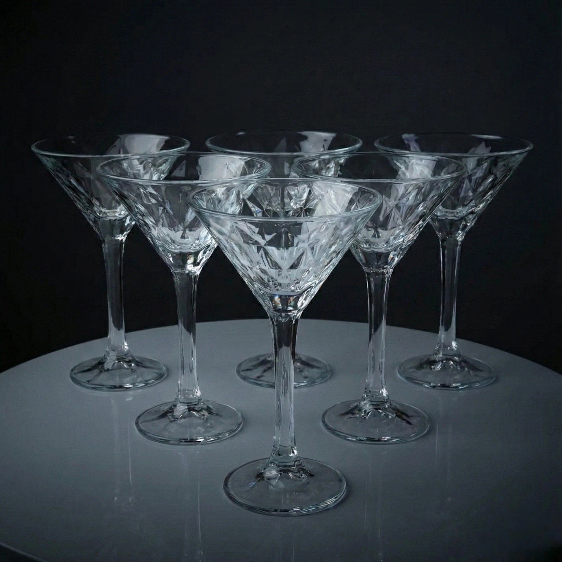 Elevate your cocktail presentation with this exquisitely crafted crystal-style martini glass set, designed to bring elegance and precision to every pour. Each glass features a wide V-shaped bowl adorned with intricate faceted detailing that captures and refracts light beautifully, enhancing the visual appeal of your beverages. The sharply defined geometric cuts lend a luxurious, handcrafted look, making every drink feel like a curated experience.