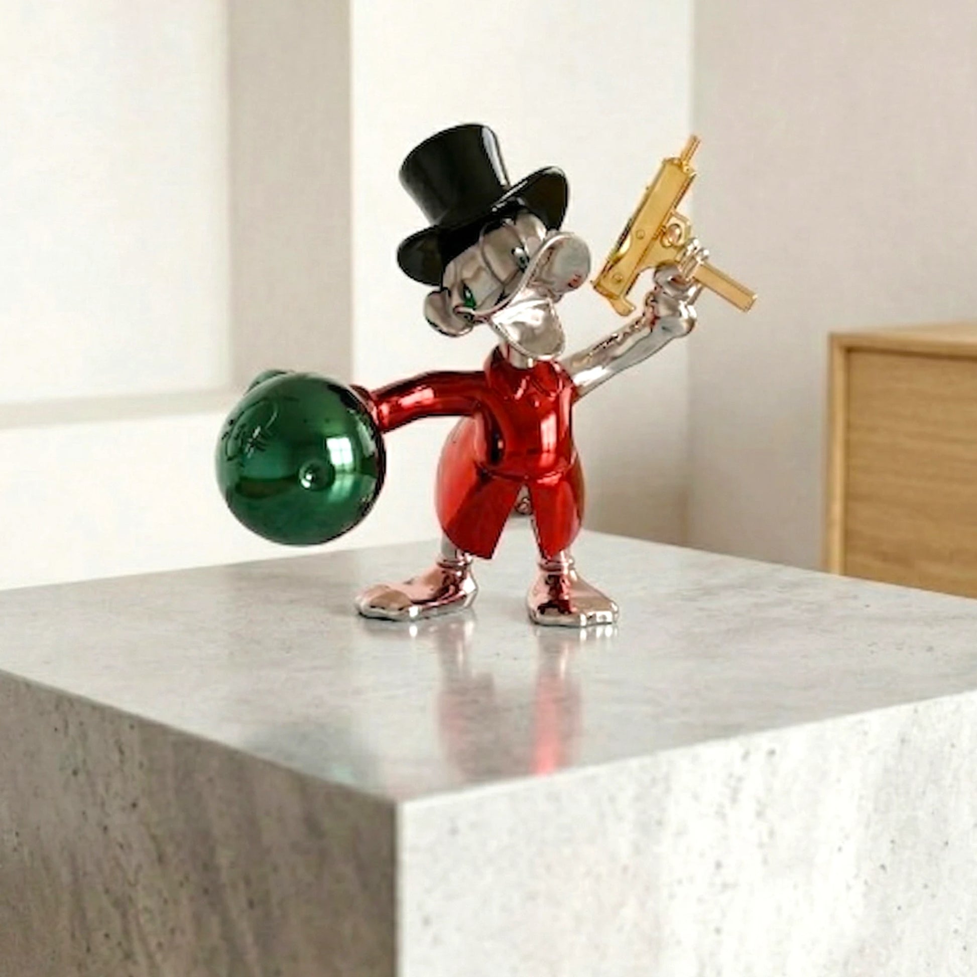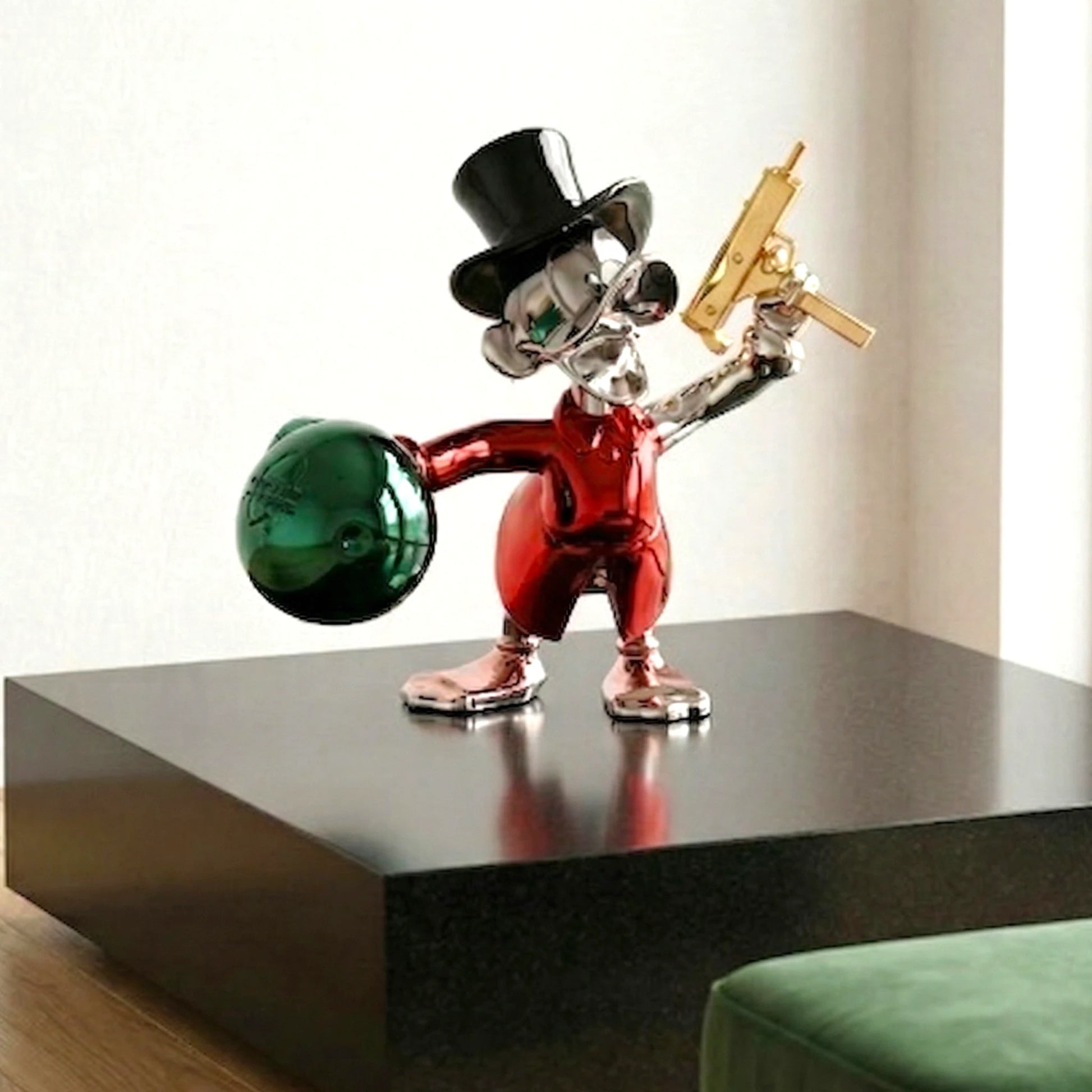 Introduce a bold, character-led statement into your space with the Fortune Guard Duck, a striking decorative figurine designed to represent confidence, control, and a refined sense of luxury through expressive design and premium finishes. Featuring a rich crimson red body paired with high-gloss chrome silver surfaces and elevated gold accents, this piece instantly commands attention while maintaining a polished and sophisticated aesthetic that blends seamlessly into modern interiors. The design showcases a distinctive character holding a money bag in one hand and a stylized weapon in the other, symbolizing authority over wealth and a fearless approach to success, making it a strong narrative-driven decor element for those who prefer pieces that go beyond the ordinary. The deep red tone introduces intensity and visual energy into your setup, acting as a powerful anchor that enhances contrast within neutral or layered interiors, while the chrome silver detailing reflects light beautifully, adding dimension and a contemporary edge. Gold accents further elevate the overall look, bringing warmth and a premium finish that enhances the visual richness of the piece. The glossy surface ensures that the figurine remains dynamic throughout the day, interacting with light to create subtle reflections that shift with your environment. Designed for versatile placement, it works effortlessly across consoles, coffee tables, shelves, and entryways, where it naturally becomes a focal point without requiring excessive styling. Its structured and stable base ensures secure placement while maintaining a clean and refined footprint, allowing it to integrate seamlessly into curated spaces. Whether you are looking to add personality to a living room, create a bold visual layer in your workspace, or elevate a styled corner, the Fortune Guard Duck delivers a balance of storytelling, color, and premium materiality, transforming your space into one that reflects ambition, strength, and distinctive design sensibility.