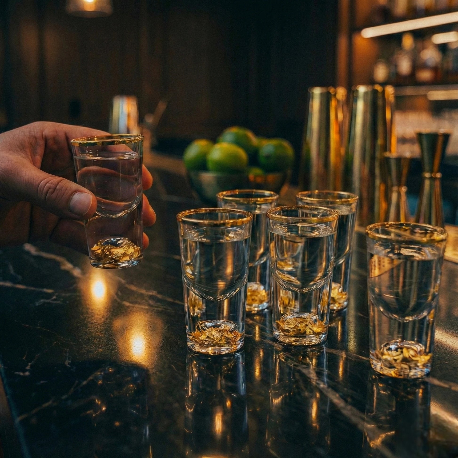 Introduce understated luxury to your barware collection with this exquisitely crafted premium shot glass set. Designed for refined entertaining, each glass is made from high-clarity transparent glass and finished with a delicate gold rim that adds a subtle touch of opulence. The base of each shot glass features an elegant gold accent embedded within the glass, creating a striking visual contrast while enhancing depth and sophistication.