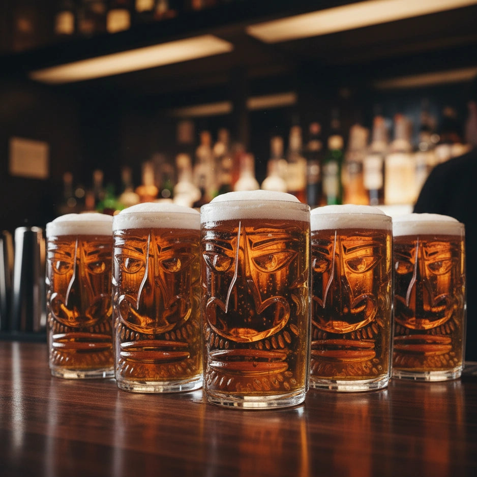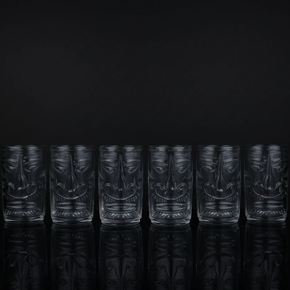 Enhance your exotic cocktails with this striking Set of 6 Totem Face Tiki Glasses. Each highball glass is deeply carved with a detailed, stylized Tiki/Totem face design, featuring prominent brow lines and a carved nose. With a large 460 ML capacity, this robust 6-piece set is perfect for large, heavily garnished tropical drinks like Mai Tais and Zombies. The tumblers feature a transparent, brilliant Clear glass color.